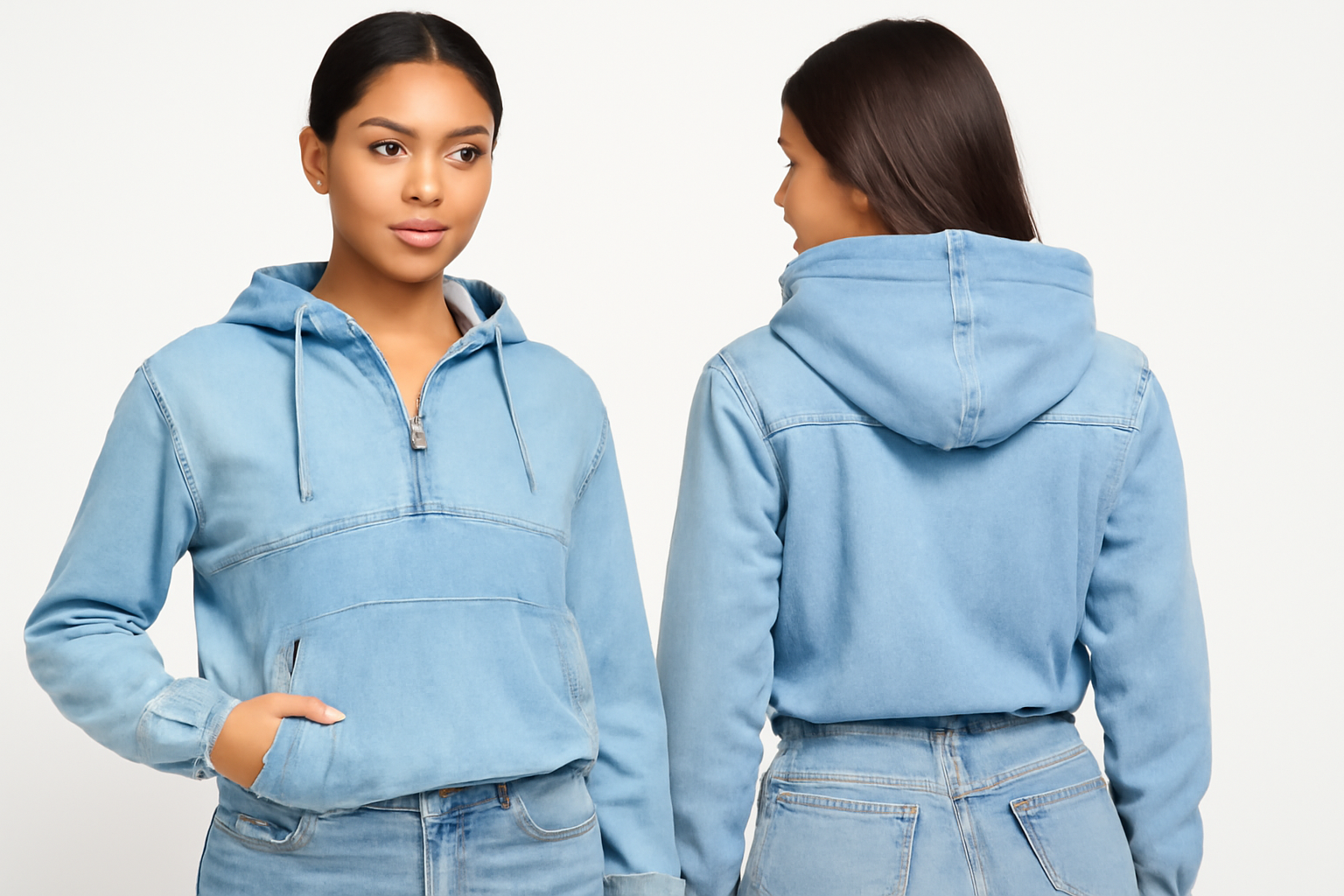 Say hello to the Alvorina™ Denim Half-Zip Hoodie — a cropped essential with a washed denim look, soft elastic details, and a half-zip design that layers with ease. Classic style, made simple.